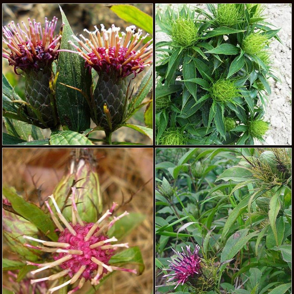 多年生草本,株高30-80厘米。根莖肥厚粗大,略呈拳狀,灰黃色,莖直立,基部木質(zhì)化。葉互生,莖下部的葉有長柄,葉片3深裂或羽狀5深裂,邊緣具刺狀齒;莖上部葉柄漸短,葉片不分裂,呈橢圓形或卵狀披針形。頭狀花序單生于枝端,形大;總苞片7-8層,基部為一輪羽狀深裂的葉狀總苞所包圍;花多數(shù)著生在平坦的花托上,全為管狀花,花冠紫色;雄蕊5,聚藥,花藥線形;雌蕊1,子房下位。瘦果長圓狀橢圓形,稍扁,表面被絨毛,冠毛羽狀。花期7-9月,果期9-11月。